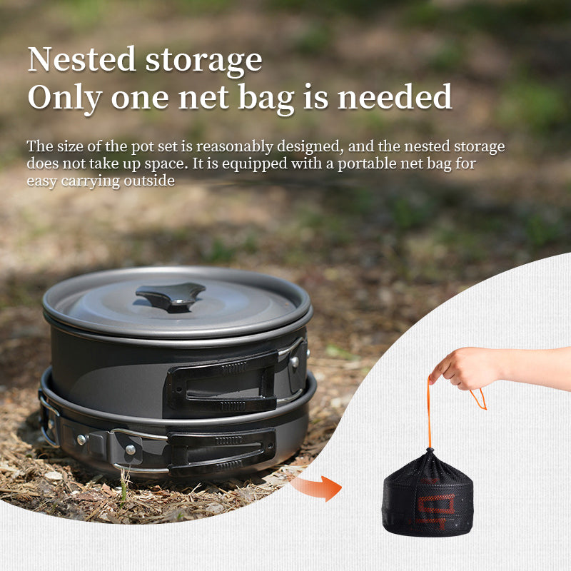 The set includes a pot and a pan, giving you diverse cooking options. The even heat distribution ensures that your food is cooked to perfection, whether you're boiling water, simmering a stew, or frying campfire snacks. It's an essential item for any outdoor lover who wants to enjoy great food in the outdoors.