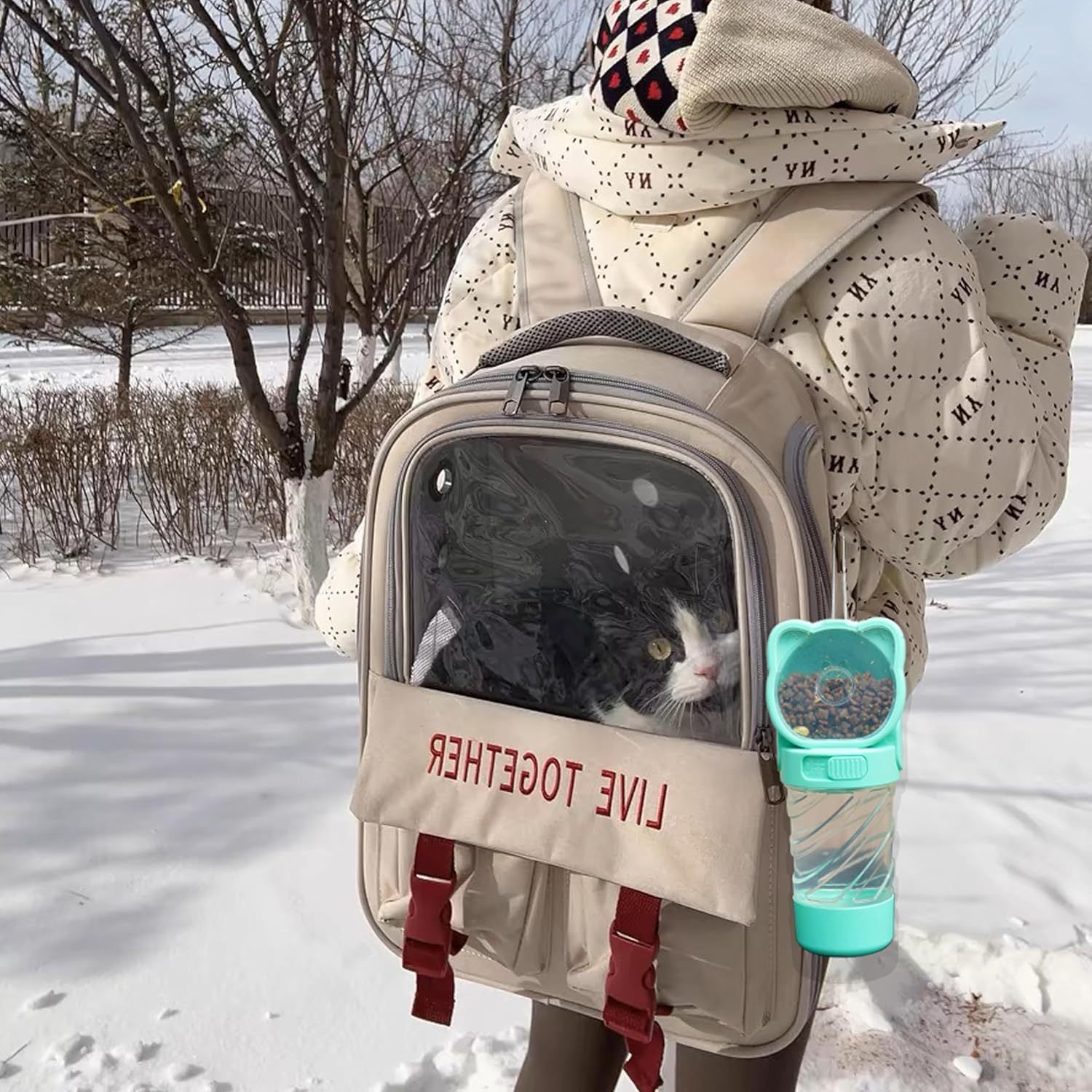Upgraded Bigger Capacity: This water bottle can hold max 12.3 ounces (350 ml) of water and 200 g food. It not only ensures dog drinking water easily but also cat, rabbit or other small pet to drinking water easily. You can put this bottle into your pocket, backpack or hanging on your hand with sling rope.