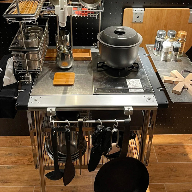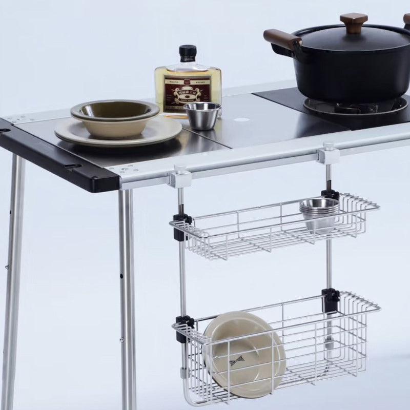 - Expand setup by hanging accessories: Camping table hooks, trash bag holders, drain baskets, lamp stands, or storage shelves.