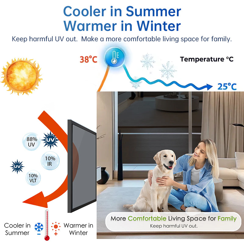 Product Features1. Privacy Protection - This one - way privacy window film creates a mirror - like appearance by reflecting the brighter side, effectively providing privacy without sacrificing the view. It prevents prying eyes during the day while allowing natural light to enter. However, at night, the effect is reversed, so it's advisable to draw the curtains.2. Thermal Control and Energy Savings - Our heat - control window film reflects 87% of infrared rays, reducing heat transfer through the glass. It's an economical solution to keep your space cool in summer and retain heat in winter, helping you save on energy bills. Note: Do not apply it to double - panel windows exposed to prolonged sunlight.3. UV Protection and Glare Reduction - Blocking up to 90% of UV rays, this window film safeguards floors, furniture, and curtains from fading. It also protects your eyes and skin from harmful UV radiation. With a 14% visible light transmittance (VLT), it effectively reduces glare while still allowing some visible light in, creating a comfortable indoor environment.4. Hassle - Free Installation - Enjoy a stress - free installation process with our static - cling window film. Since it's adhesive - free, there's no need for messy chemicals. You can easily apply it with water and remove it without leaving any residue, making it ideal for renters and households that need removable window tinting.5. Wide Application - Our privacy window film can be applied to any flat, clean glass surface, including kitchens, living rooms, bedrooms, playrooms, garages, classrooms, aquariums, sliding doors, waiting areas, attics, enclosed porches, and more. It's a cost - effective solution for blocking light in apartments, commercial buildings, hotels, classrooms, and libraries.